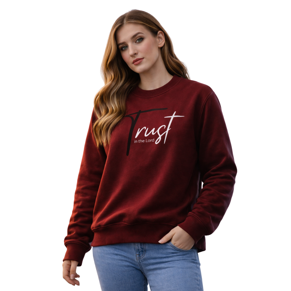 Wear your faith with pride. This Cardinal Red crewneck sweatshirt features a bold “Trust in the Lord” typographic design in white and black. A comfortable, inspiring piece perfect for daily wear or church groups.