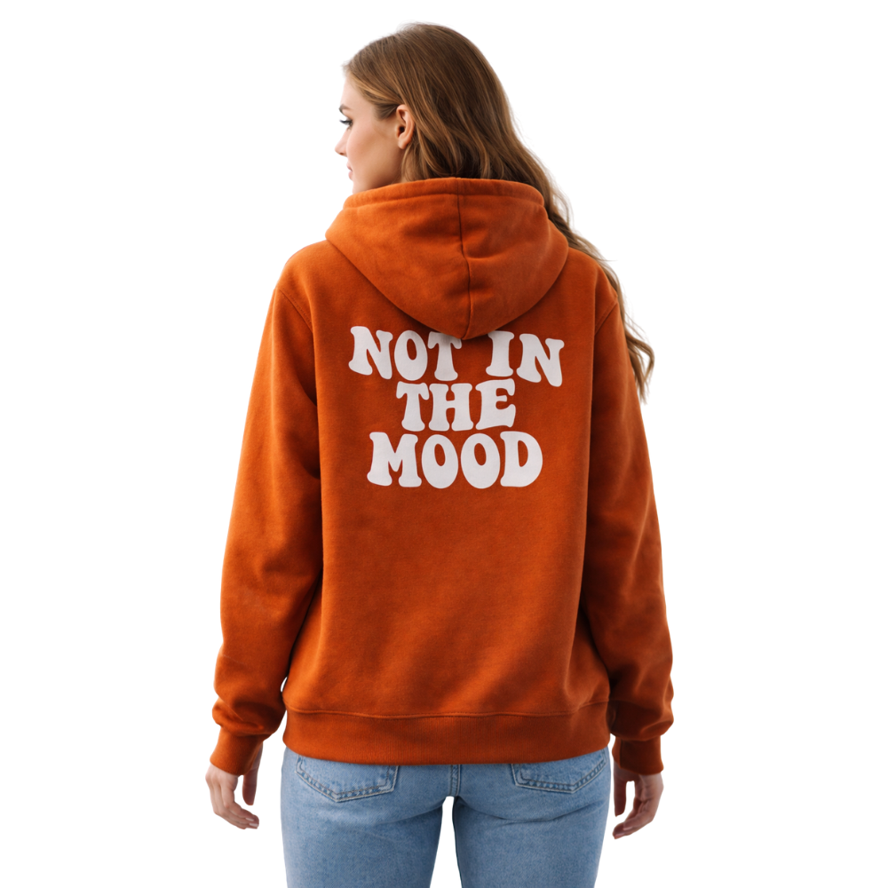 Make a statement without saying a word. This “Not In The Mood” slogan hoodie features a striking burnt orange colourway with a contrasting white drawstring. Designed for comfort and style, it includes a classic kangaroo pocket and ribbed cuffs. Perfect for casual days out in the UK weather.